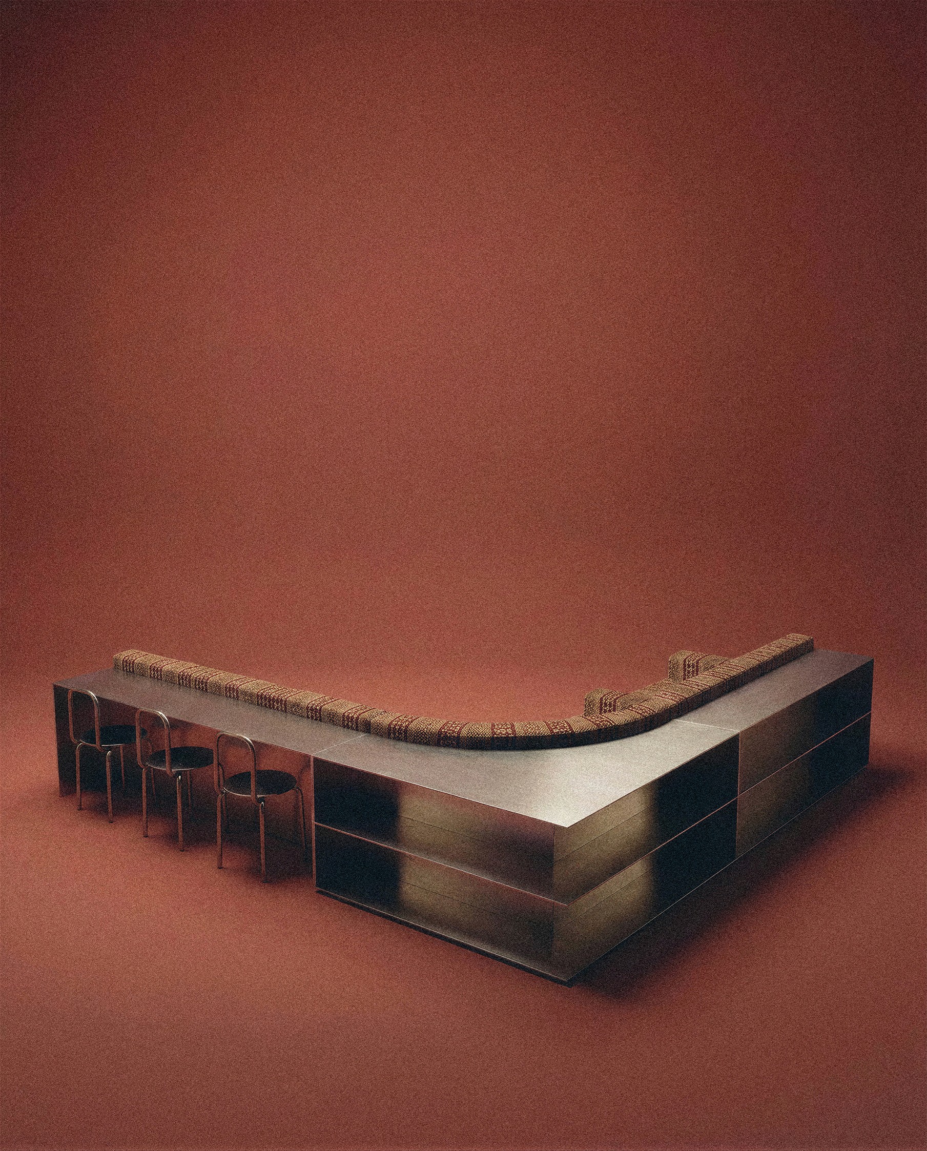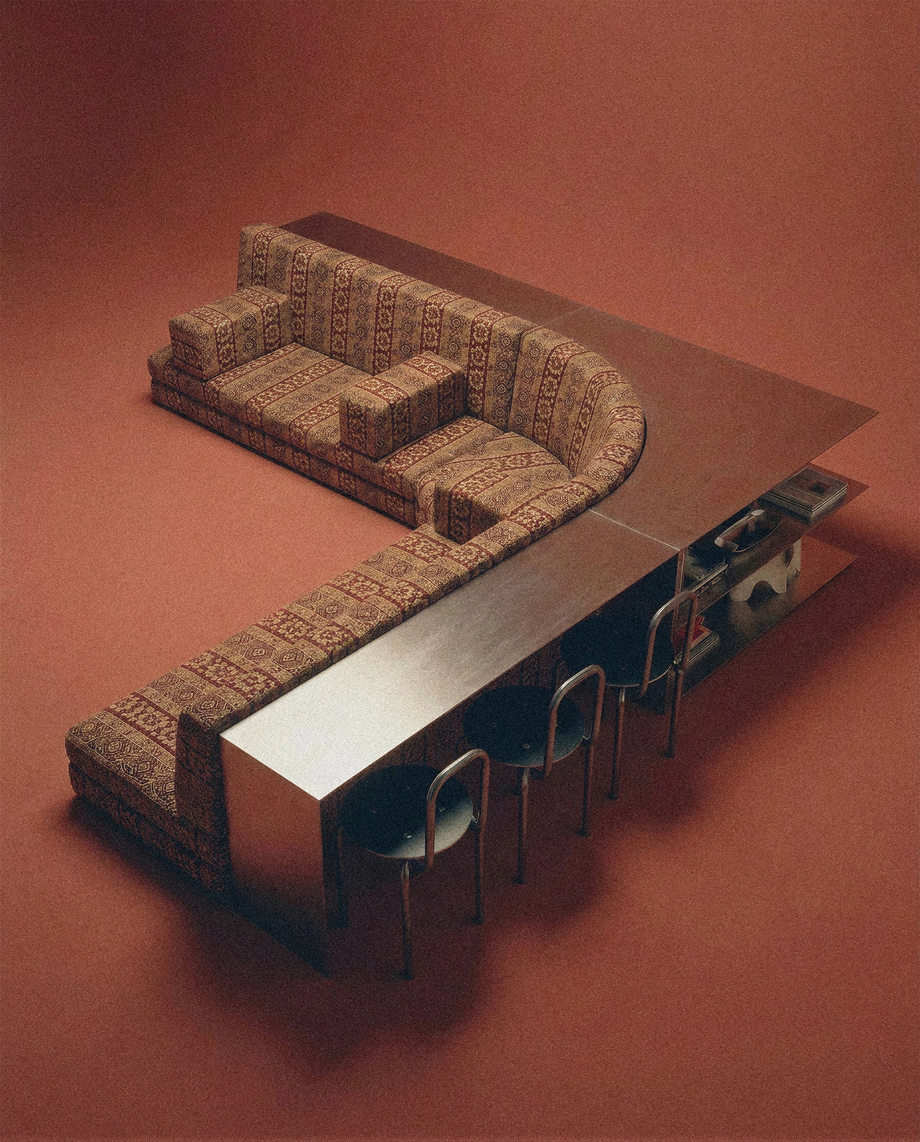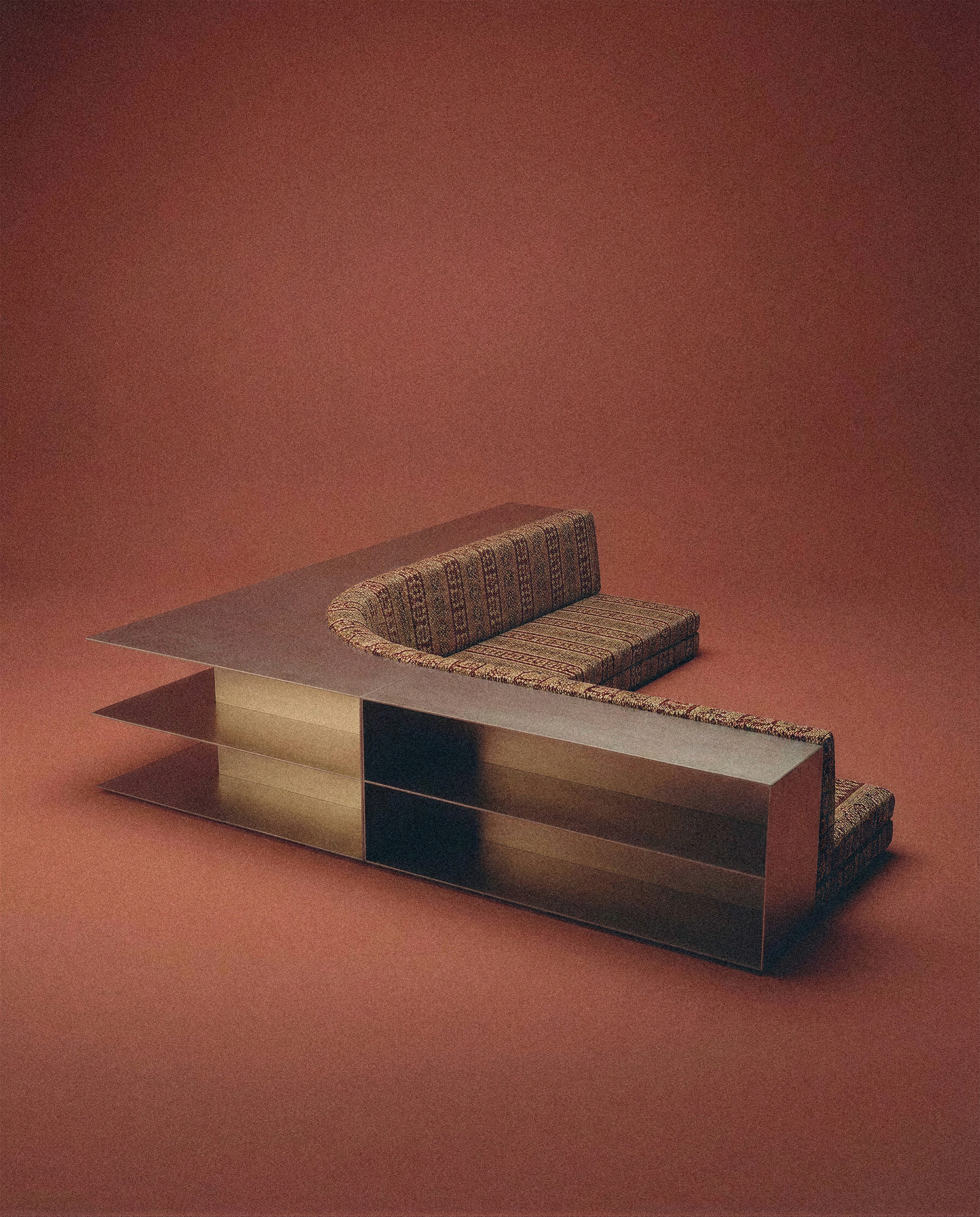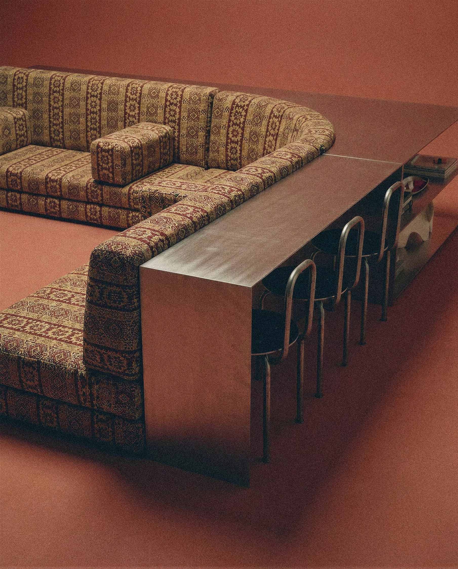This low seating corner evokes the feeling of a pit sofa and blends clean lines with cultural depth.